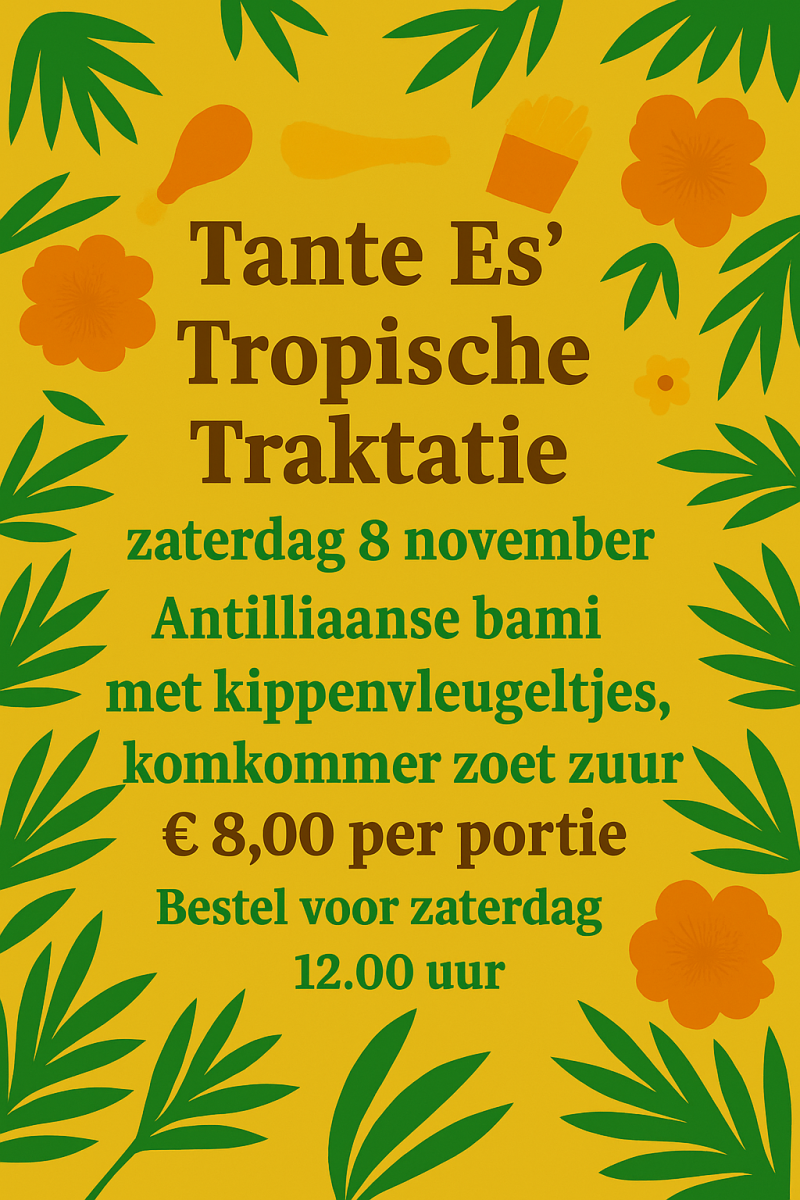 Elke zaterdag bereidt Tante Es een heerlijke Antilliaanse maaltijd. Huisgemaakt, vers en vol smaak – van stoofvlees tot lekkere kip en andere tropische specialiteiten. Kom gezellig eten in het buurthuis of laat het bij je thuisbezorgen en proef de authentieke smaken van de Antillen.